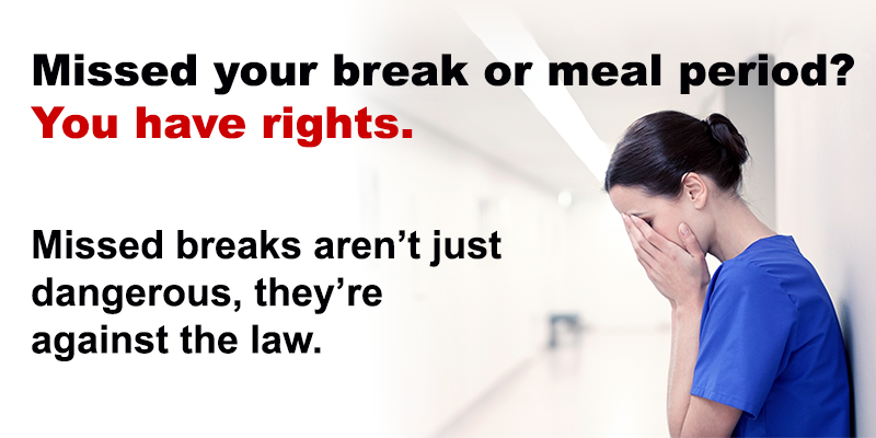 PAY FOR NON-COMPLIANT MEAL AND REST PERIODS: The hospital must pay you one hour of your regular rate of pay for failing to provide a compliant meal period(s) per shift (i.e., late, no lunch break, interrupted or on-premise meal periods). The hospital must also pay you one hour of your regular rate of pay for failing to provide a compliant rest break(s) per shift (i.e., no break not